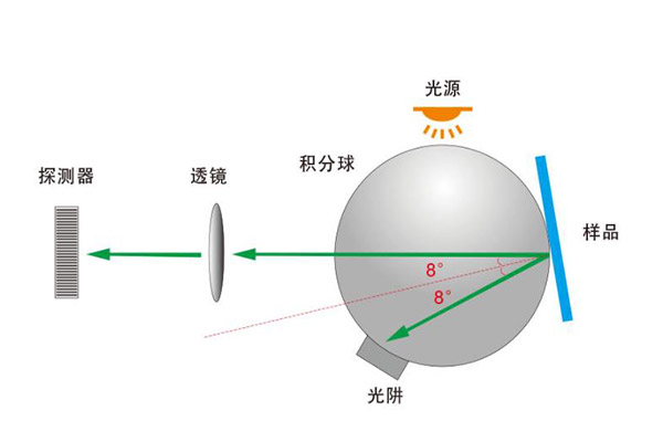 D/8積分球色差儀中“D”代表漫射照明,“8”表示在與樣品表面法線成8°的方向上接收反射光,這種角度能夠有效捕捉到樣品表面的顏色信息,同時兼顧了鏡面反射和漫反射的成分。本文對D/8積分球色差儀的測量模式做了介紹。